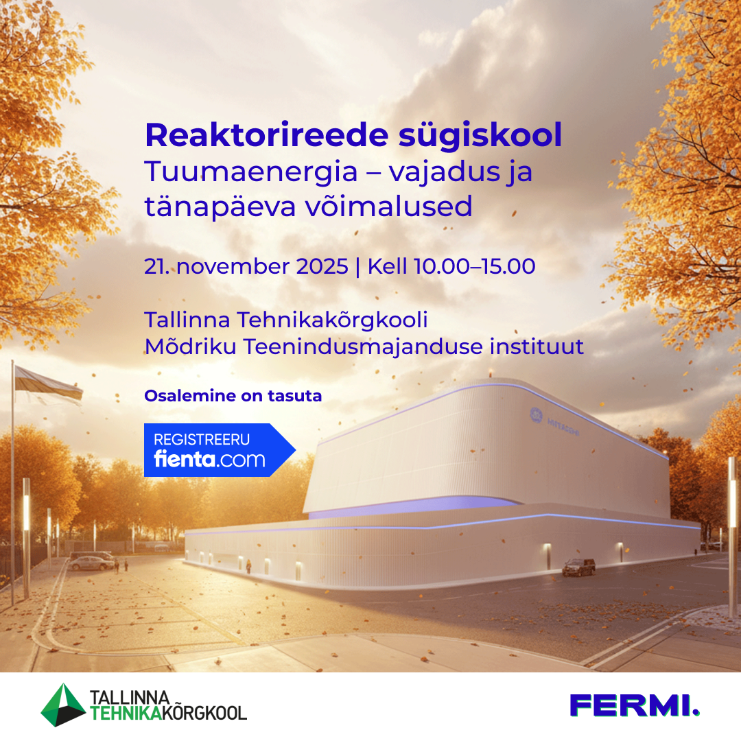 Tallinna Tehnikakõrgkooli Teenusmajanduse instituut koostöös Fermi Energiaga kutsub osalema Reaktorireede sügiskoolis „Tuumaenergia – vajadus ja tänapäeva võimalused", mis toimub reedel, 21. novembril 2025 kell 10.00-15.00 Tallinna Tehnikakõrgkooli Mõdriku Teenusmajanduse instituudis (Tiigivahe tee 1).